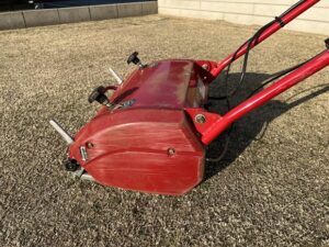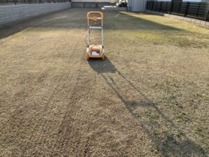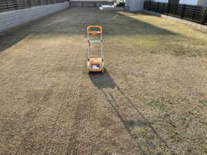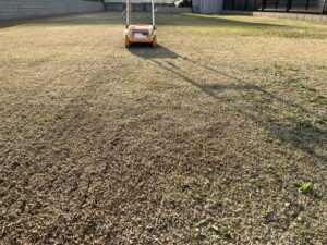 バーチカルカット、芝刈り、ともに、集草箱は使わず、サッチや刈り芝はそのまま地面に散布。